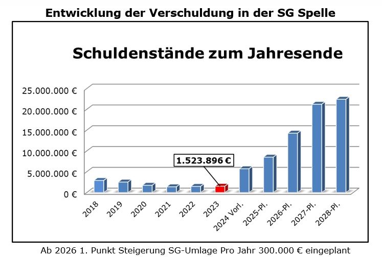 In der Sitzung des Rates der Gemeinde Spelle vom 05.02.2024 wurde der Haushalt der Gemeinde Spelle für das Jahr 2024 beschlossen. Die Gruppe aus SPD-UBS!-FDP hat den Haushaltsentwurf aufgrund der hohen geplanten Verschuldung abgelehnt. Ein wesentlicher Grund dafür ist ein Grundstückskauf zu einem völlig überhöhten Preis, der deutlich über dem Bodenrichtwert liegt.